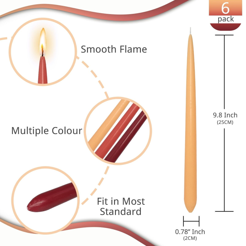 [Size]Conical candles 10inch in length, approx 0.8inch in diameter of bottom, they fit most standard candle holders. Multipurpose table candlesticks perfect for party, wedding churches and dinner candles. [Unscented Taper Candles]The colored unscented taper candles makes them ideal for those who prefer a subtle ambiance without fragrances. They will be appropriate for people who have some kind of allergy. [Sensational Gradient]Sensational gradient taper candles, experience the beauty of transition from deep hues to light colors. The colorful candles set included: 2*light orange, 2*dark orange, 2*wine red.