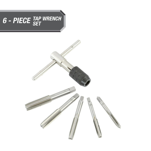 The Hyper Tough 6-Piece Tap Wrench Set is an indispensable tool for any DIY enthusiast or professional mechanic, designed to create threaded holes or rethread existing ones with precision and ease. Crafted from high-quality tungsten steel, the SAE-sized taps ensure superior strength and durability, capable of withstanding rigorous use. The set features a T-Handle wrench with a non-slip grip chuck, providing excellent control and stability during operation. This comprehensive set includes taps in the following sizes: 1/4-inch NC20, 5/16-inch NC18, 3/8-inch NC16, 7/16-inch NC14, and 1/2-inch NC13. With its robust construction and versatile application, the Hyper Tough Tap Wrench Set is an essential addition to any toolbox, offering reliability and performance for a wide range of threading tasks.